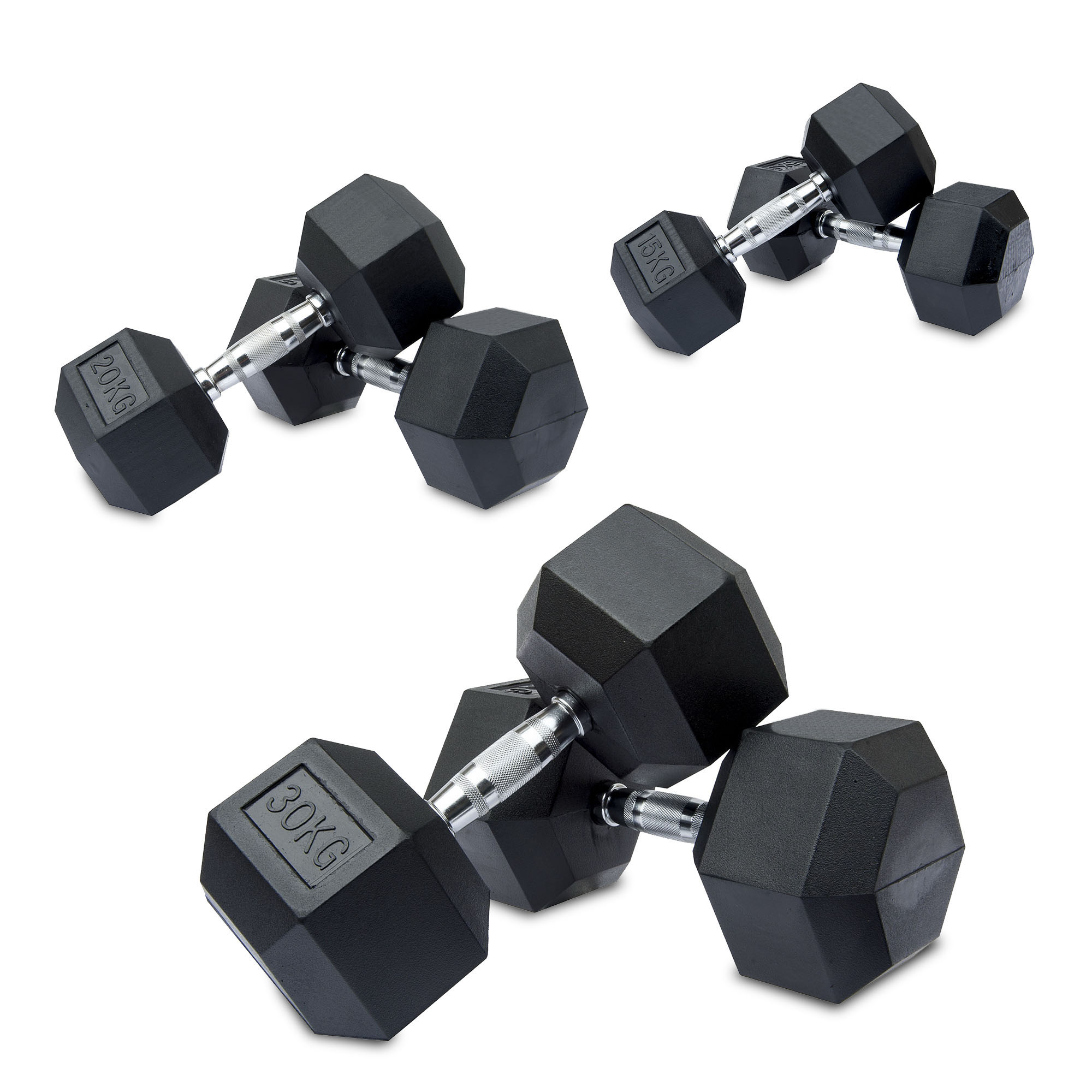 Οι εξάγωνοι αλτήρες χτίζουν και ενδυναμώνουν το σώμα σας. Σχεδιασμένοι με εργονομικές λαβές χρωμίου ώστε να μη σας γλιστρούν από το χέρι και να μεγιστοποιούν την άνεση, αυτοί οι αλτήρες είναι ιδανικά εργαλεία για τη γράμμωση των χεριών, του στήθους, της πλάτης, των κοιλιακών και των ποδιών. Το εξάγωνο σχέδιο αποτρέπει την κύλιση, ενώ το άοσμο λάστιχο προστατεύει το πάτωμά σας και χαρίζει κομψότητα. Εκτελέστε έναν πραγματικά τεράστιο αριθμό ασκήσεων με τους εξάγωνους αυτούς αλτήρες.