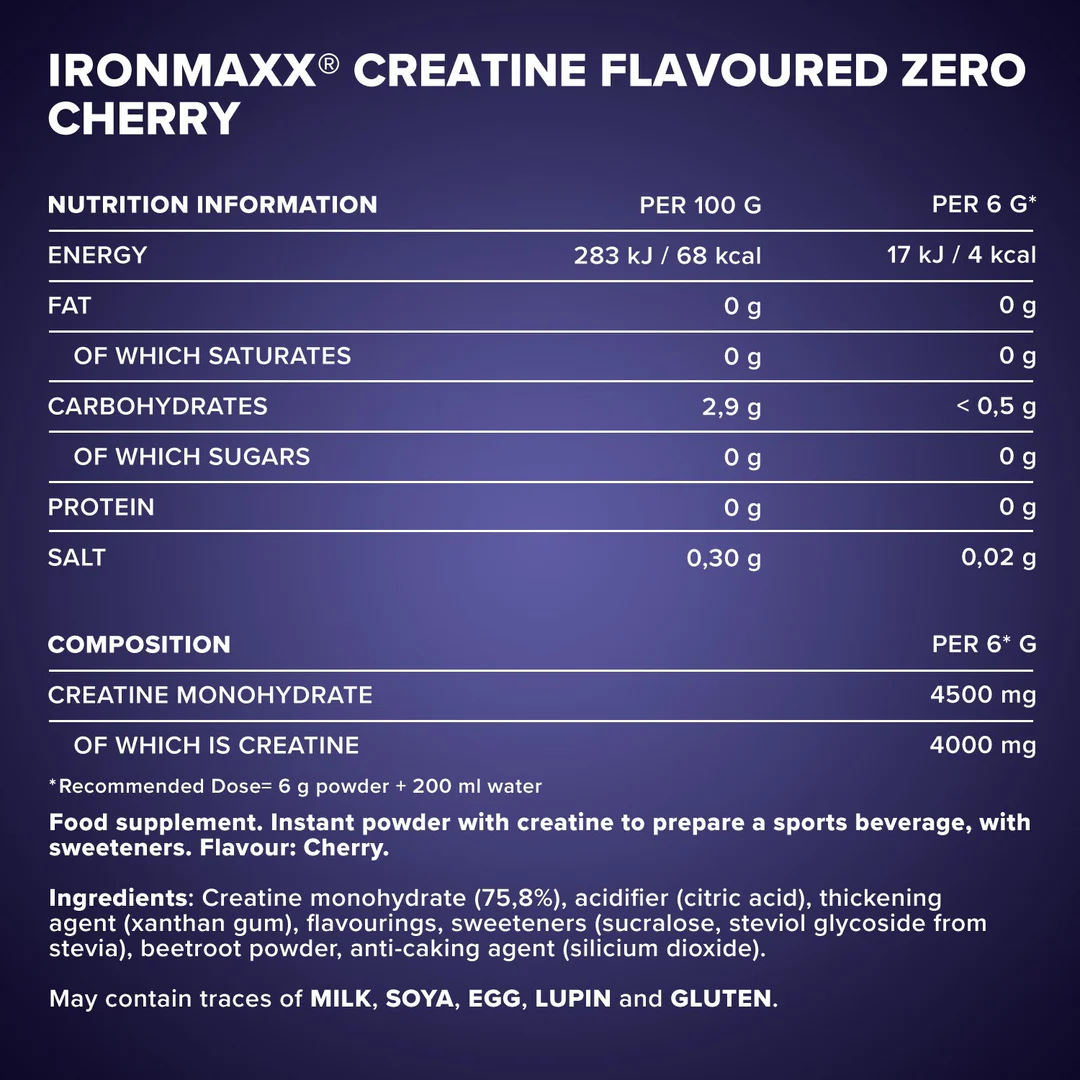 Η IronMaxx Creatine Flavoured Zero Cherry συνδυάζει μέγιστη καθαρότητα, φρουτώδη γεύση και επιστημονικά αποδεδειγμένη αποτελεσματικότητα, προσφέροντας την ιδανική υποστήριξη για δύναμη, εκρηκτικότητα και αποκατάσταση.