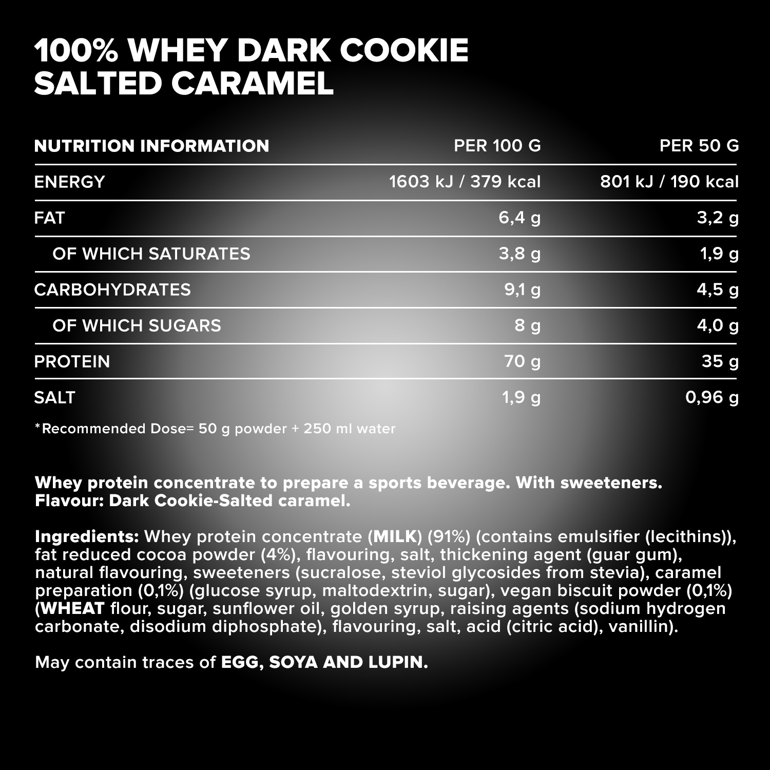 Προετοιμασία: Προσθέστε 50g σκόνης (περίπου 4 γεμάτες κουταλιές της σούπας) σε 250ml νερό και ανακινήστε καλά σε ένα σέικερ για ~20 δευτερόλεπτα, μέχρι να διαλυθεί πλήρως.